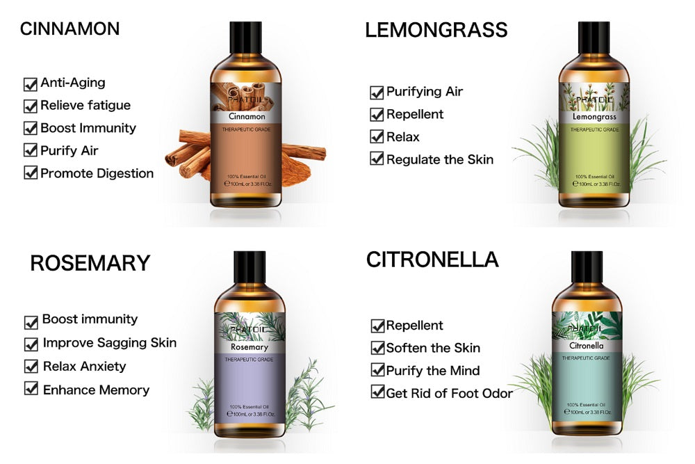 Discover the versatility of Phatoil 100ml Pure Natural Essential Oils for aromatherapy. These high-quality oils are made from 100% pure natural ingredients, ensuring therapeutic-grade quality. Use them with humidifiers, aromatic diffusers, and more for a luxurious experience.
