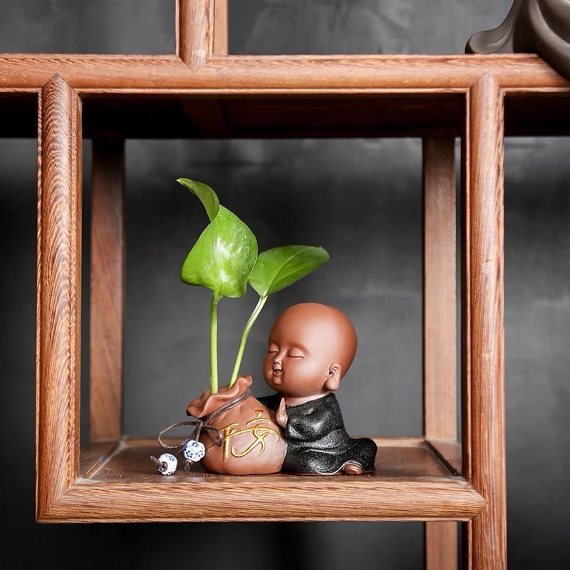 The two little monks are practicing Zen with a happiness bag and a safety bag respectively. Their sweet smile is radiating positive vibes and good Feng Shui!